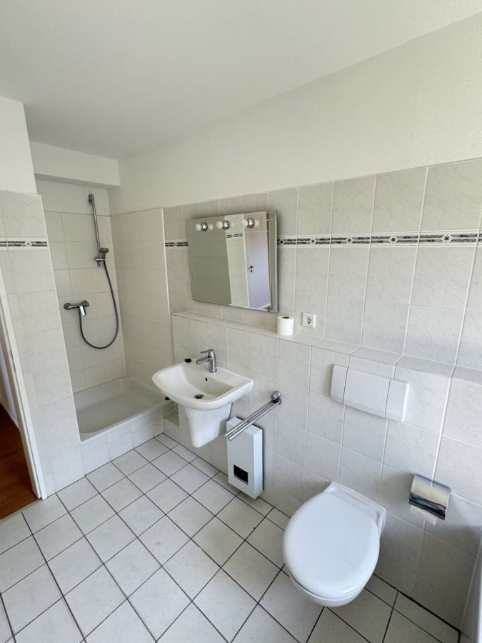 Das hell geflieste Tageslichtbad ist mit einer Dusche und Badewanne ausgestattet.