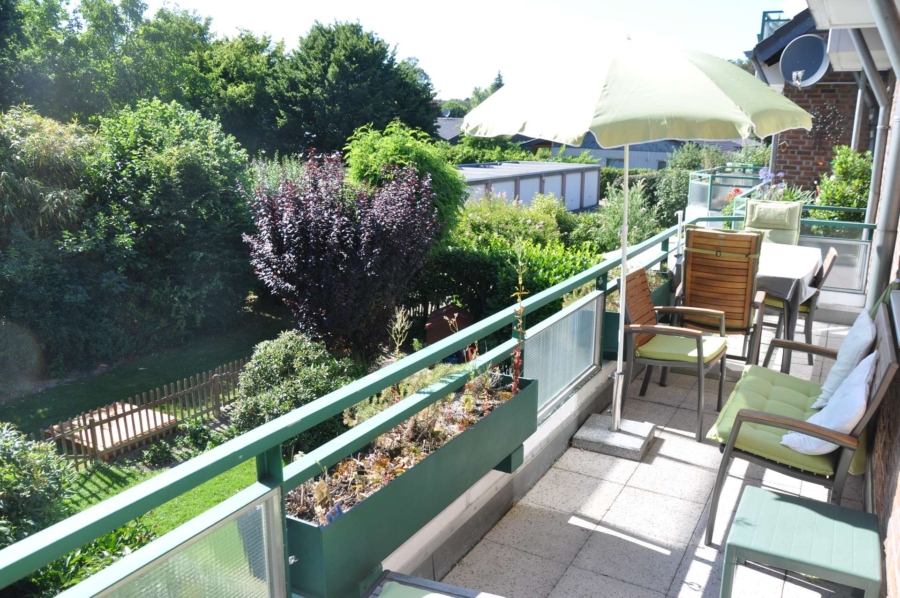 Den sehr großen Balkon in Süd-/Westlage erreichen Sie sowohl vom Wohnzimmer als auch vom Schlafzimmer aus.