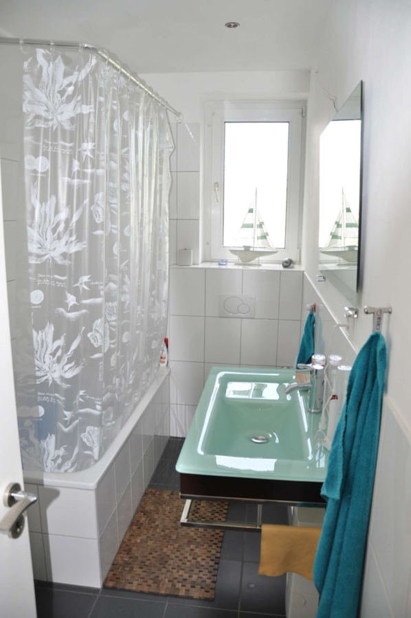 Das Badezimmer mit Tageslicht und Fenster ist mit einer Badewanne und einem modernen Waschtisch ausgestattet.